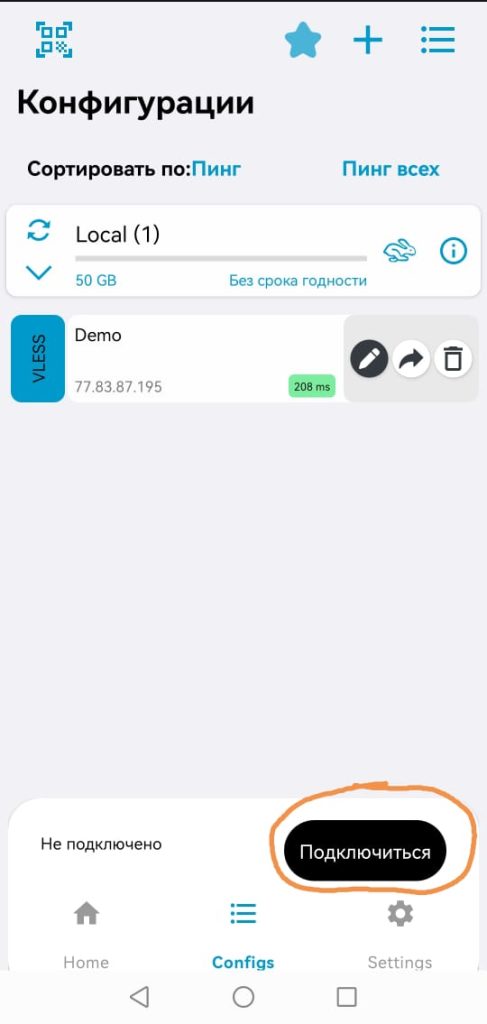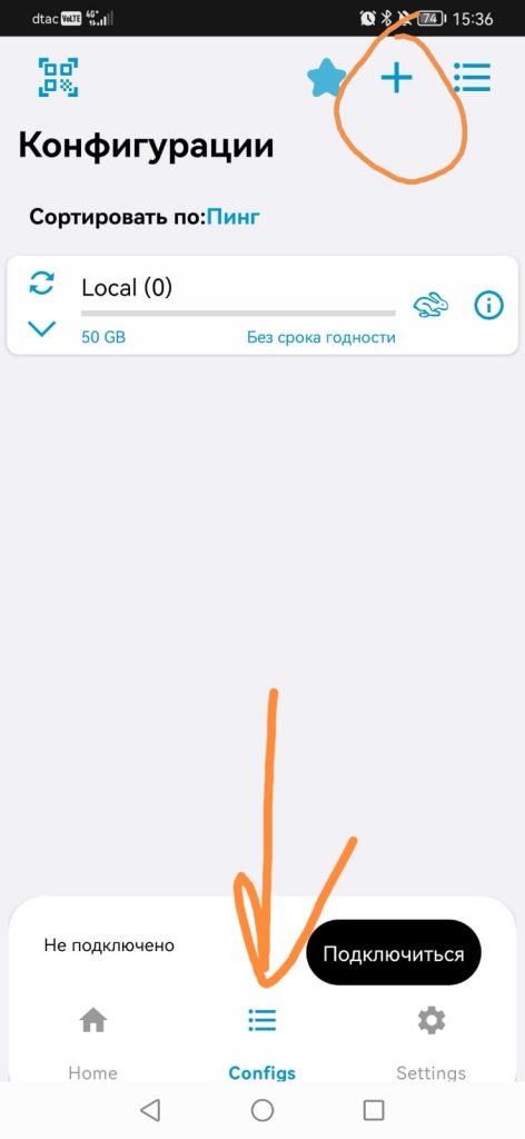 После установки клиента V2BOX надо нажать центральную кнопочку внизу config, затем плюсик в верхнем правом углу.